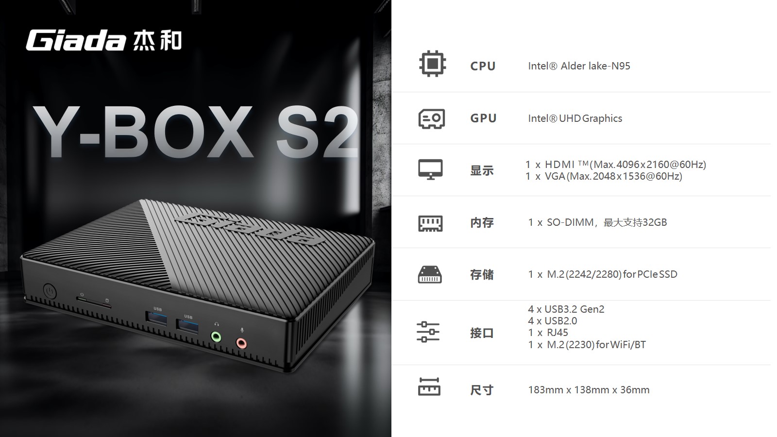 云終端Y-BOX S2處理器平臺為Intel® Alder Lake-N,是英特爾首款采用7納米制程的產(chǎn)品系列。內(nèi)存采用主流的DDR4,支持M.2和eMMC多存儲設(shè)備可選,滿足客戶對高數(shù)據(jù)讀寫的需求,最大支持32GB;云終端Y-BOX S2具備一個HDMI、VGA接口,可以連接到顯示器、電視及投影儀,HDMI接口支持最高分辨率為4096 x 2160@60Hz,VGA接口支持最高分辨率為2048 x 1536@60Hz。