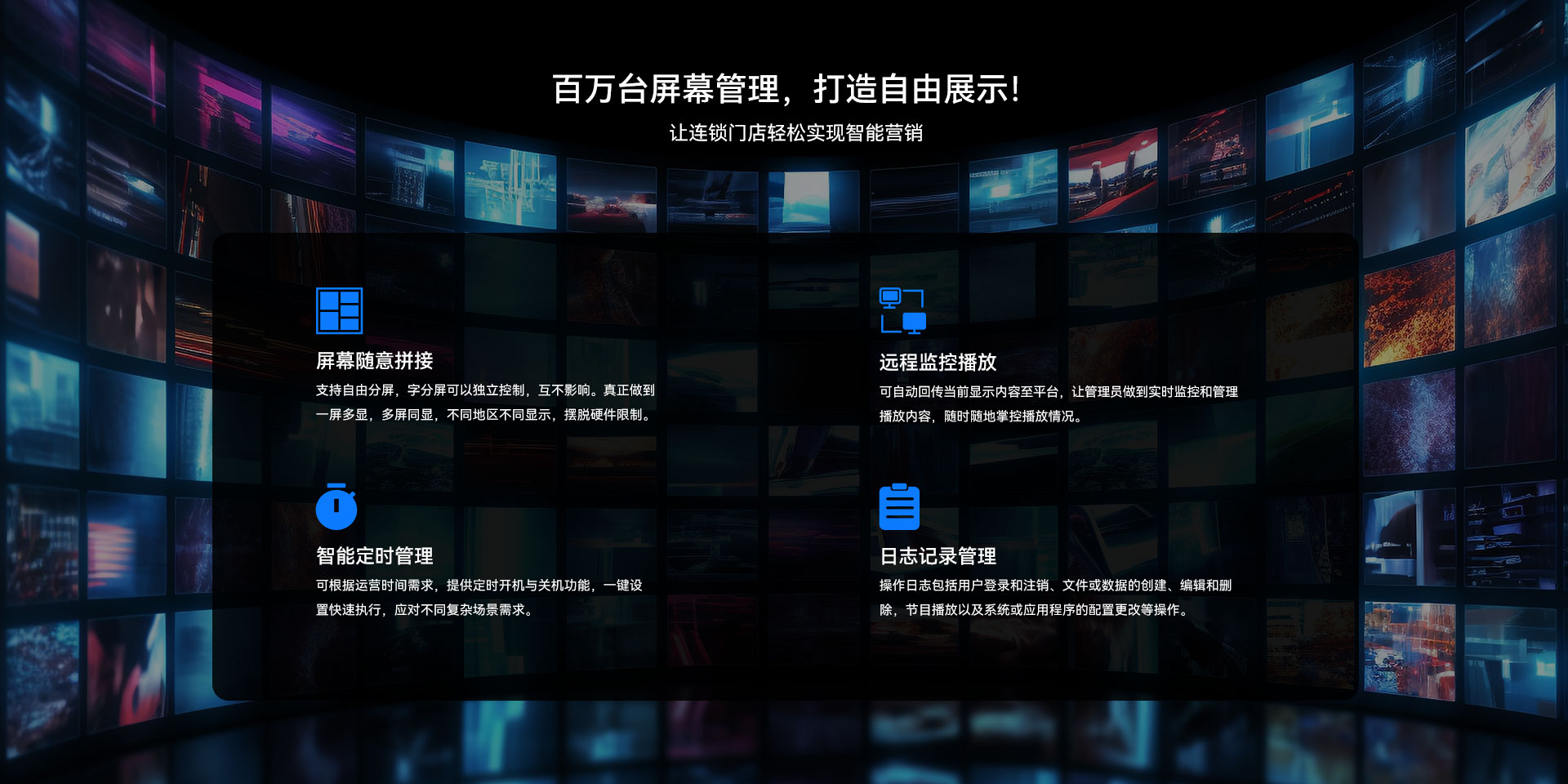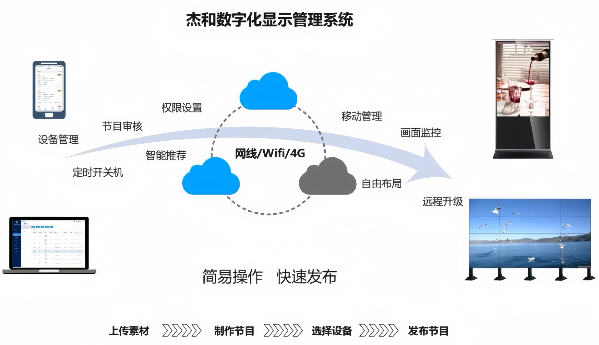 為此,杰和科技打造一整套數(shù)智化信息管理系統(tǒng),該系統(tǒng)由服務(wù)器(后臺(tái))管理端和設(shè)備播放端組成,運(yùn)用顯示屏將企業(yè)宣傳、廣告展示、緊急通知等信息全面展示在大眾面前。通過將音視頻圖文、網(wǎng)頁資訊、時(shí)間天氣、字幕等多樣化內(nèi)容的組合,形成一段精美的節(jié)目,并使用網(wǎng)絡(luò)作為載體,隨時(shí)將制作好的節(jié)目推送到各地的媒體設(shè)備上進(jìn)行播放。