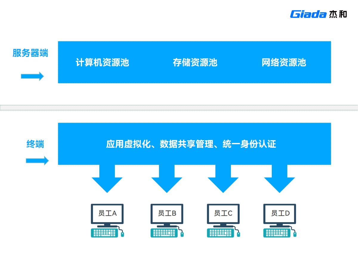 在了解到云終端的優(yōu)勢后,該證券公司決定引入杰和科技云終端解決方案。該方案選擇IDV架構(gòu),通過云桌面管理平臺將虛擬的桌面組件,比如應(yīng)用軟件、操作系統(tǒng)和用戶數(shù)據(jù)等轉(zhuǎn)移至云數(shù)據(jù)中心進行托管,并進行統(tǒng)一管理、集中控制。員工日常辦公使用杰和科技云終端YBOX-P1訪問桌面操作系統(tǒng)。