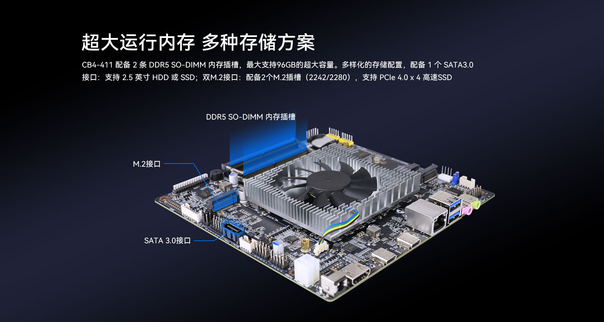 在內(nèi)存方面,CB4-411主板具備強大的性能,采用DDR5內(nèi)存,最大支持容量96GB,滿足各種復雜應用場景的需要,充分滿足用戶需求。