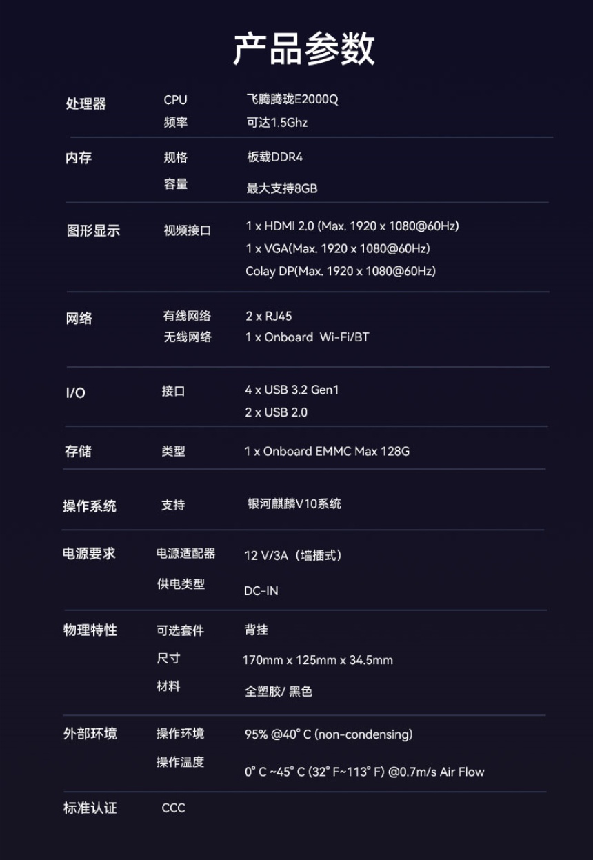 云終端VT32搭載了飛騰騰瓏E2000Q處理器和其他國產組件,E2000Q集成2個FTC664和2個FTC310處理器核,主頻達1.5GHz。