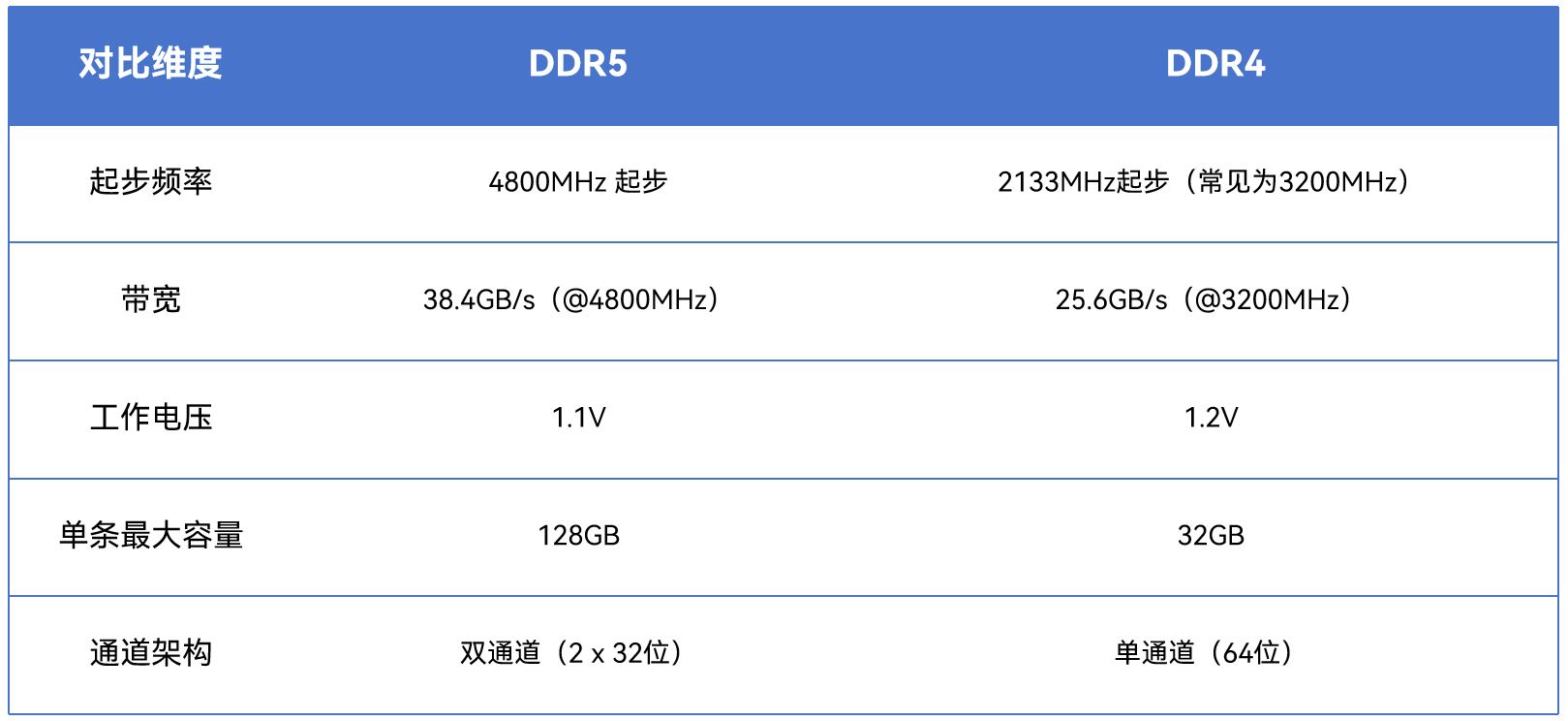 DDR4 3200MHz帶寬為25.6GB/s,DDR5-4800帶寬為38.4GB/s,DDR5內(nèi)存在架構(gòu)上引入了獨(dú)立雙通道設(shè)計(jì)。