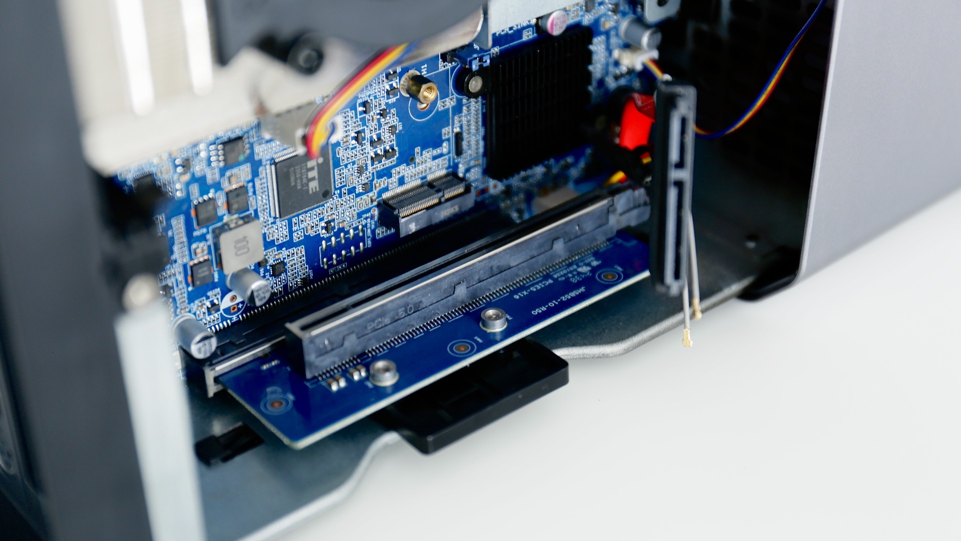 打開(kāi)WA814內(nèi)部,我們可以看到PCle5.0 x16 高速擴(kuò)展口,它的速度高達(dá)64GB/s,可以實(shí)現(xiàn)獨(dú)立顯卡、多網(wǎng)口、高速 SSD、多 COM 等設(shè)備的擴(kuò)展。