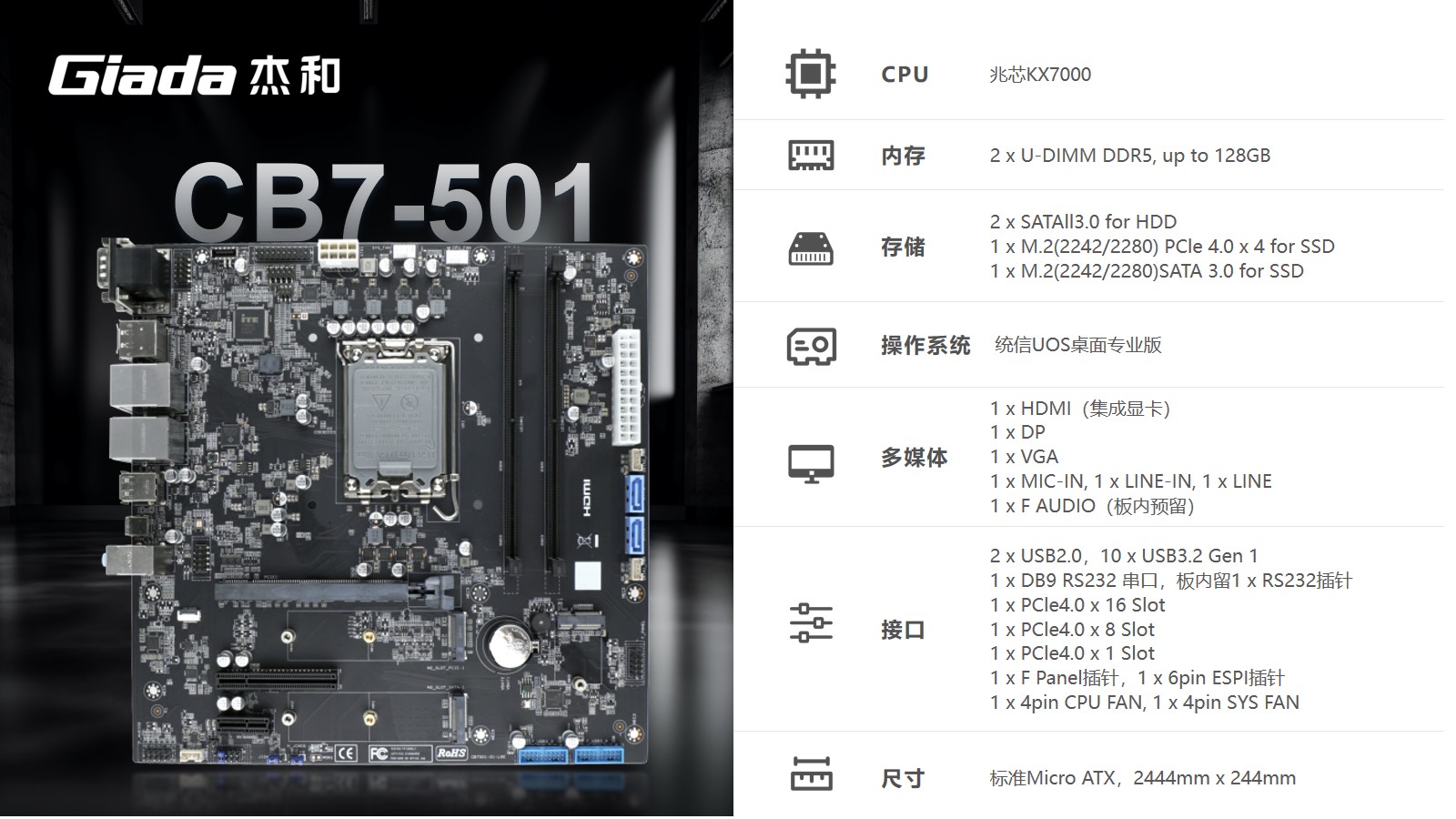 搭載兆芯開先KX-7000國產(chǎn)處理器,基于X86架構(gòu)、8核8線程,主頻達(dá)3.7GHz。支持主流雙通道DDR5內(nèi)存、配備了PCIe 4.0 x16 、 PCIe 4.0 x8 、PCIe 4.0 x1 插槽,滿足多種擴(kuò)展卡安裝需求。尺寸為標(biāo)準(zhǔn)Micro ATX,244 x 244 mm大小,搭配系統(tǒng)為統(tǒng)信UOS桌面版。