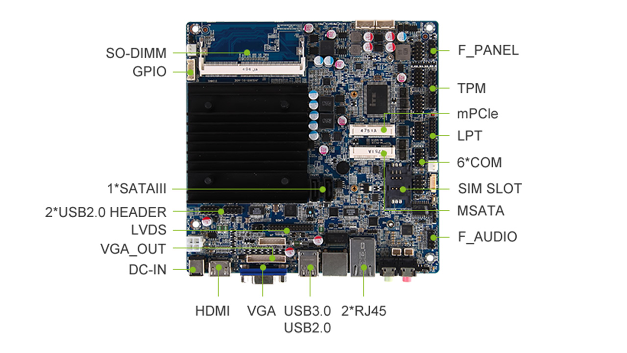 4.支持HDMI、VGA、LVDS多種顯示接口,支持Audio-out、Mic-in、SPK L/R多種音頻接口,同時擁有GPIO、TPM、CPU_FAN、SYS_FAN等豐富的I/O功能接口可直接用于外部設(shè)備擴展;