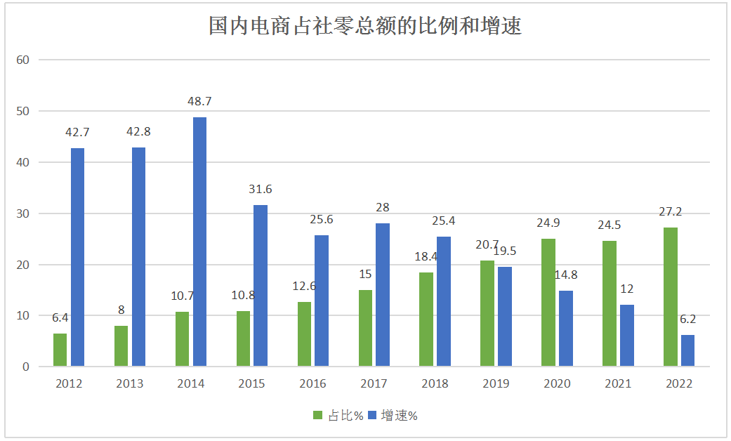 雖然打賭之初,業(yè)內(nèi)的專業(yè)人士就不認(rèn)為電商的占比會(huì)超過(guò)社零總額的50%,但還是要看數(shù)據(jù)說(shuō)話。2023年初,據(jù)國(guó)家統(tǒng)計(jì)局?jǐn)?shù)據(jù)顯示,2022年中國(guó)社會(huì)消費(fèi)品零售總額達(dá)到43.97萬(wàn)億元,這其中實(shí)物商品網(wǎng)上零售額增長(zhǎng)6.2%達(dá)到歷史性的11.96萬(wàn)億元,已經(jīng)占到整體社會(huì)消費(fèi)品零售總額的27.2%,不過(guò)距離50%這一目標(biāo),依然相當(dāng)遙遠(yuǎn)。▼