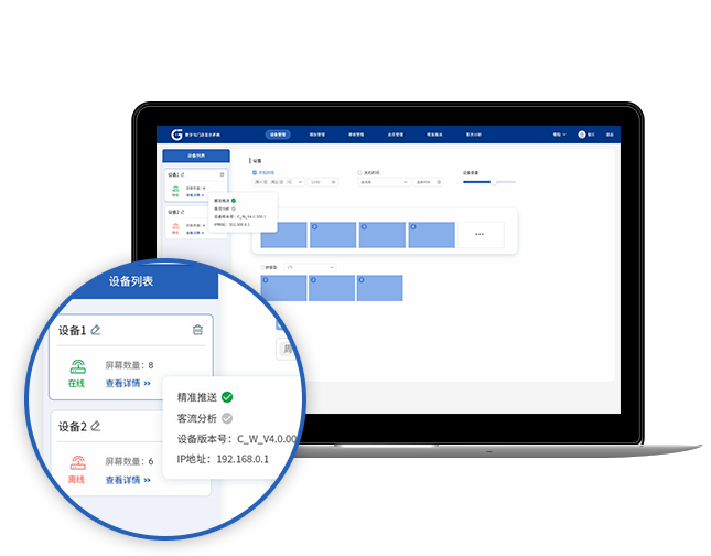 輕松查看設(shè)備的基本信息,如連接狀態(tài)、播放狀態(tài)、播放到期時(shí)間,屏幕類型等;可對(duì)設(shè)備進(jìn)行分組遠(yuǎn)程管理,遠(yuǎn)程設(shè)置定時(shí)開關(guān)機(jī)時(shí)間,控制設(shè)備音量,遠(yuǎn)程重啟、遠(yuǎn)程升級(jí),遠(yuǎn)程截屏查看實(shí)時(shí)畫面等。