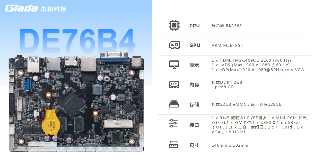 杰和科技DE76B4采用瑞芯微RK3568處理器,板載DDR4內(nèi)存,可實(shí)現(xiàn)多任務(wù)并行、更大數(shù)據(jù)集的高效處理,豐富的接口,具有性能強(qiáng)、內(nèi)存大、集成度高、擴(kuò)展能力強(qiáng)等特點(diǎn),支持在寬溫、復(fù)雜電磁等惡劣環(huán)境下穩(wěn)定運(yùn)行,可廣泛應(yīng)用于物聯(lián)網(wǎng)網(wǎng)關(guān)、邊緣存儲(chǔ)、工控平板、工業(yè)檢測(cè)、工控盒、自助終端、云終端、車載中控、機(jī)器人等行業(yè)定制市場(chǎng)。