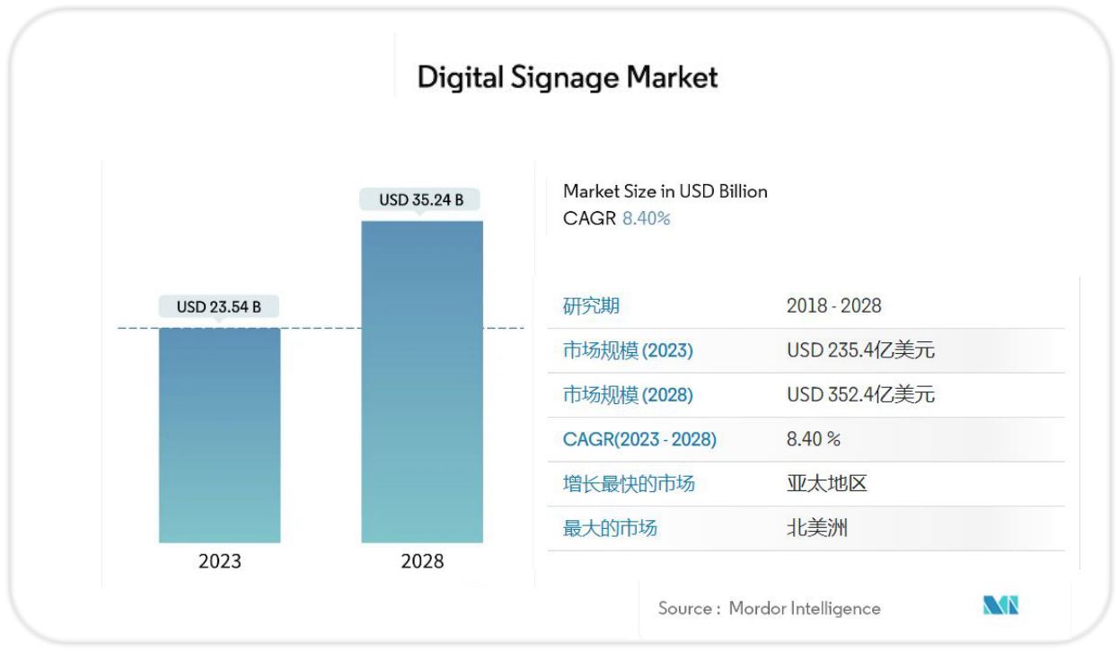 預(yù)計(jì)數(shù)字標(biāo)牌市場在未來幾年將保持穩(wěn)定增長。根據(jù)市場研究機(jī)構(gòu)Mordor Intelligence數(shù)據(jù)顯示,全球數(shù)字標(biāo)牌市場規(guī)模預(yù)計(jì)將從 2023 年的 235.4 億美元增長到 2028 年的 352.4 億美元,在預(yù)測期間(2023-2028 年)的復(fù)合年增長率為 8.40%。數(shù)字標(biāo)牌產(chǎn)品在商業(yè)垂直領(lǐng)域的采用不斷增加、新興國家的快速數(shù)字化以及顯示技術(shù)的發(fā)展是推動(dòng)數(shù)字標(biāo)牌市場整體增長的關(guān)鍵因素,數(shù)字標(biāo)牌憑借自身優(yōu)勢,在零售、教育、娛樂、交通、金融、醫(yī)療、辦公等領(lǐng)域發(fā)揮著重要作用。