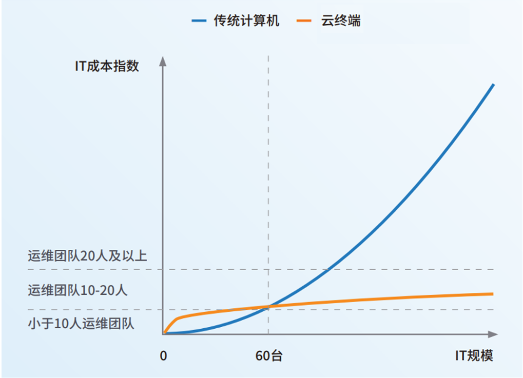 國際數(shù)據(jù)中公司IDC,基于對實際落地案例中現(xiàn)實情況的擬合建立模型,分析傳統(tǒng)計算機與云終端解決方案在不同IT規(guī)模下產(chǎn)生的實際成本。模型顯示,當IT規(guī)模大于60臺時,使用傳統(tǒng)計算機所產(chǎn)生的成本將超過云終端,且差距隨IT規(guī)模增長呈指數(shù)級增大。
